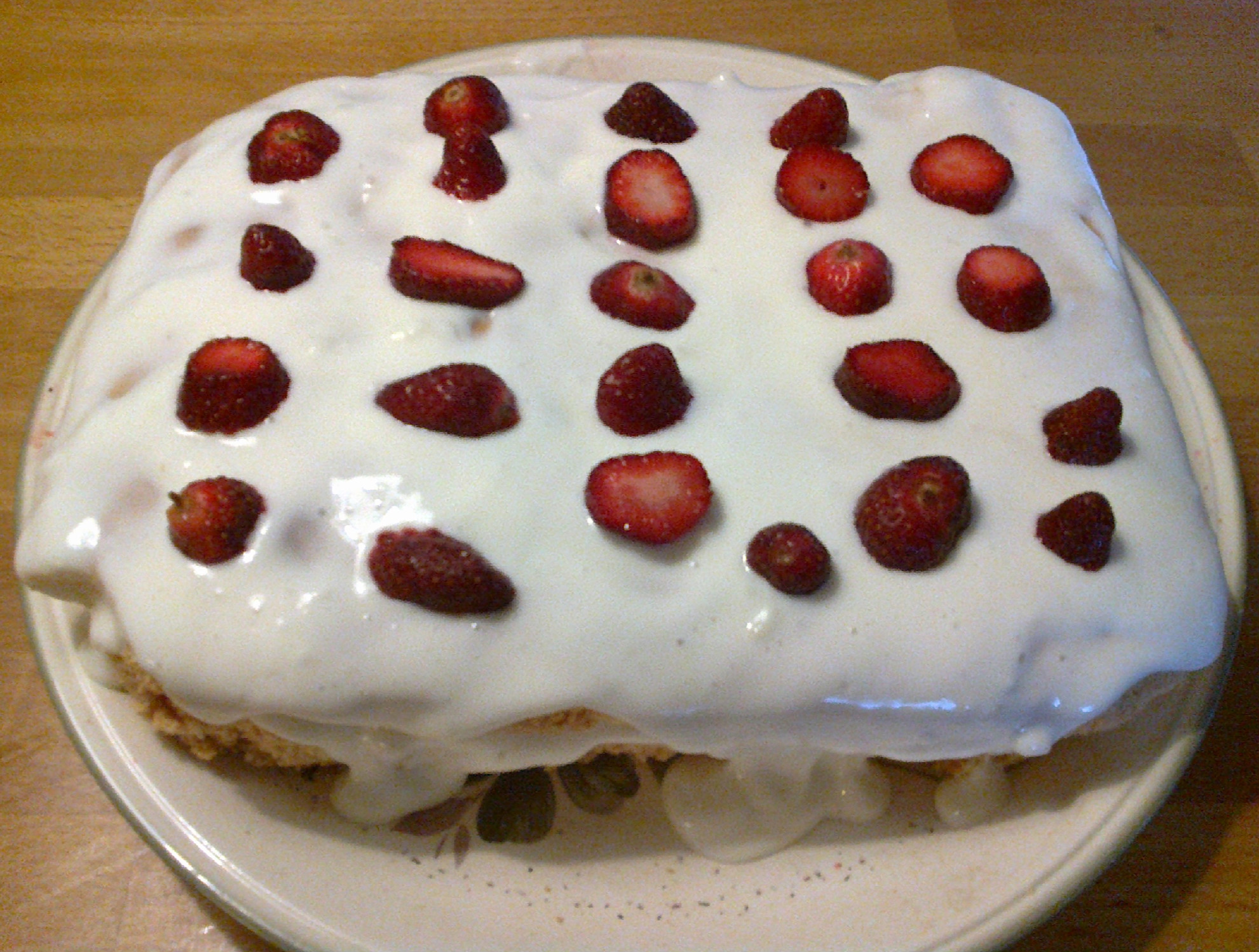 Pandispanyaları biraz sütle ıslat, içine bolca krema ve aldığı kadar çilek. Üstünü kapa ve kalan kremayı yay. Çileklerle süsle.