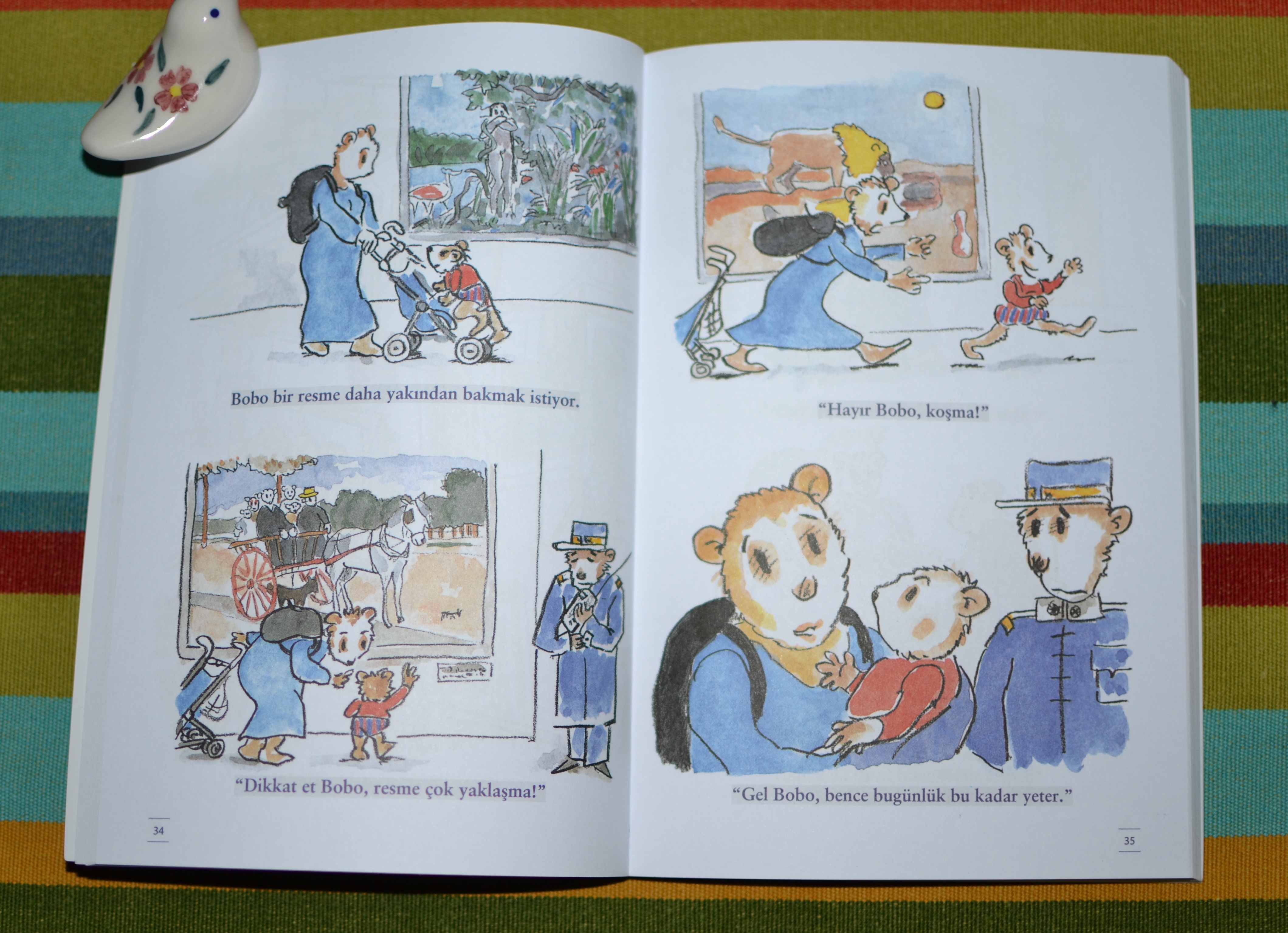 Kitapların boyutu ufak. Çocukların tek başına karıştırmasına uygun sayılmaz çünkü sayfaları ince. Ama anlattığım özellikleri nedeniyle ‘anne – çocuk zamanı’ yaşamak için çok güzel seçimler, uzun zaman dönüp dönüp kendini yeniden okutturacak cinsten. De ve Do için artık biraz geç 🙂 ama içimden bir ses küçüklerin Bobo’yu çok seveceğini söylüyor.